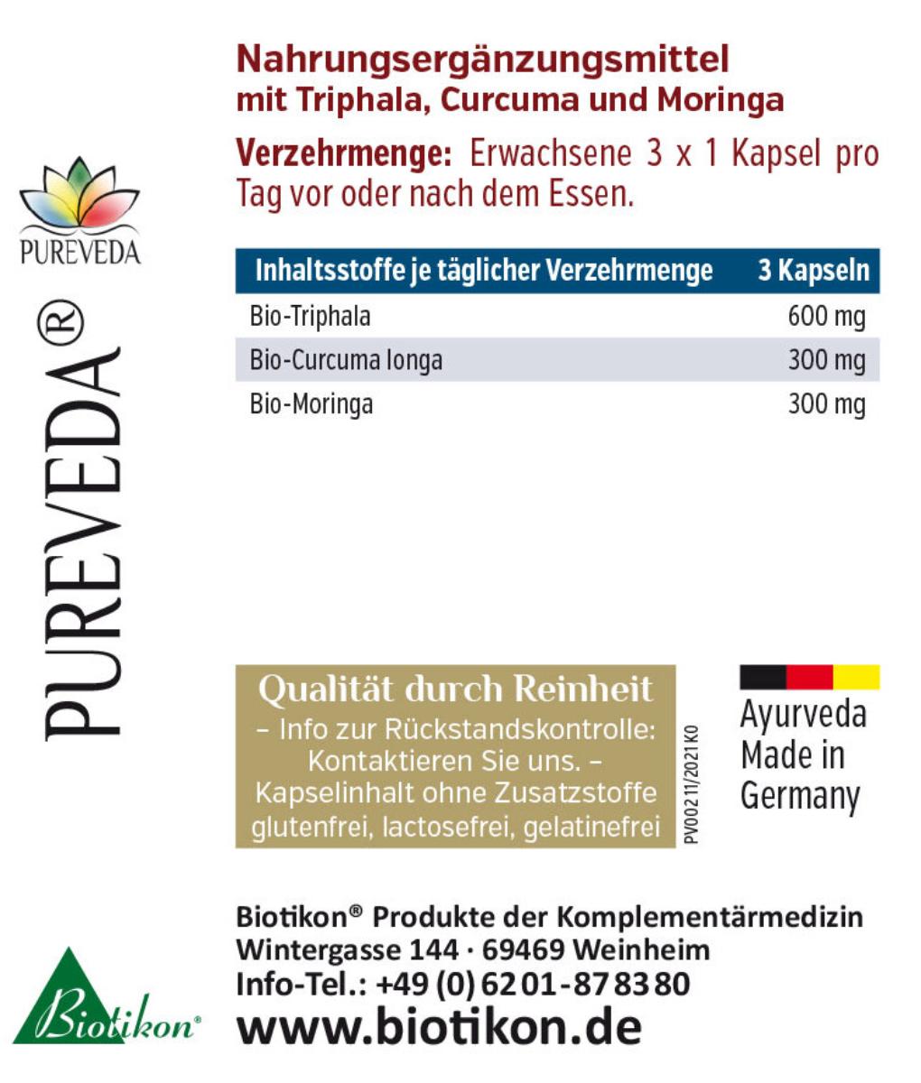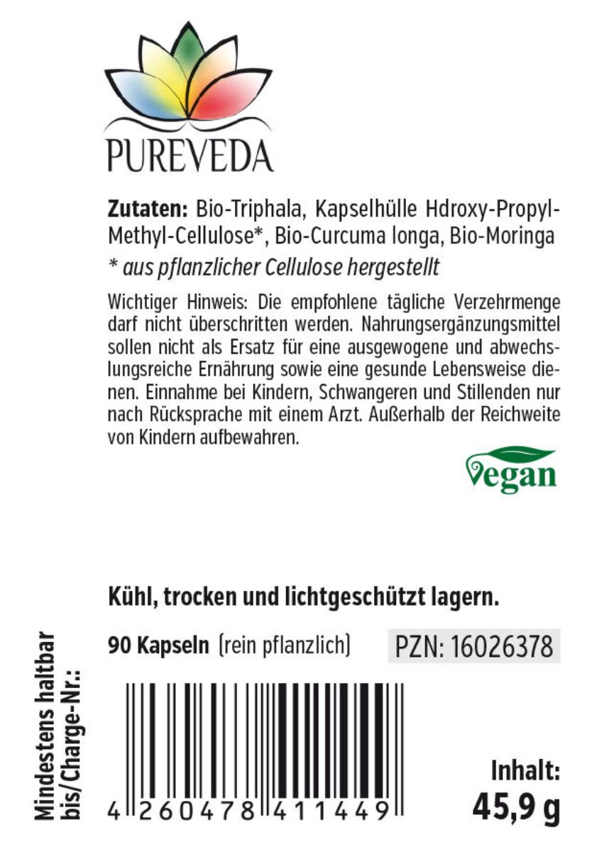Ingredienser:Økologisk Triphala, Kapselmateriale lavet af ren vegetabilsk cellulose (Hydroxy-propyl-methyl-cellulose), Økologisk Gurkemeje (Curcuma longa), Økologisk Moringa