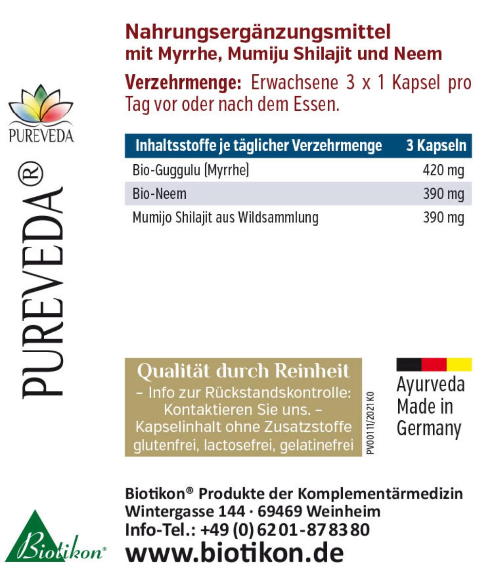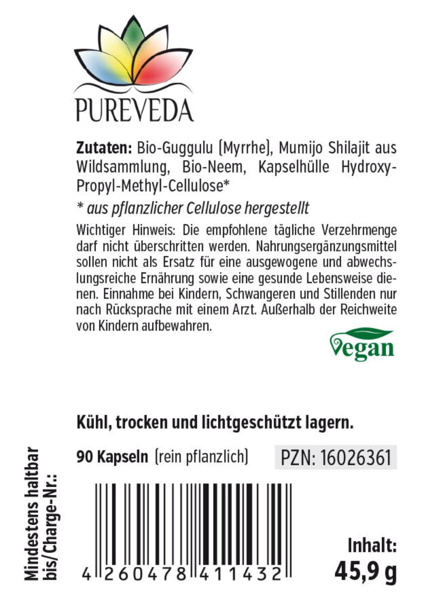 Ingredienser:Økologisk Guggulu (myrra), Mumijo Shilajit fra vild høst, Økologisk Neem, Kapselmateriale lavet af ren vegetabilsk cellulose (Hydroxy-propyl-methyl-cellulose)