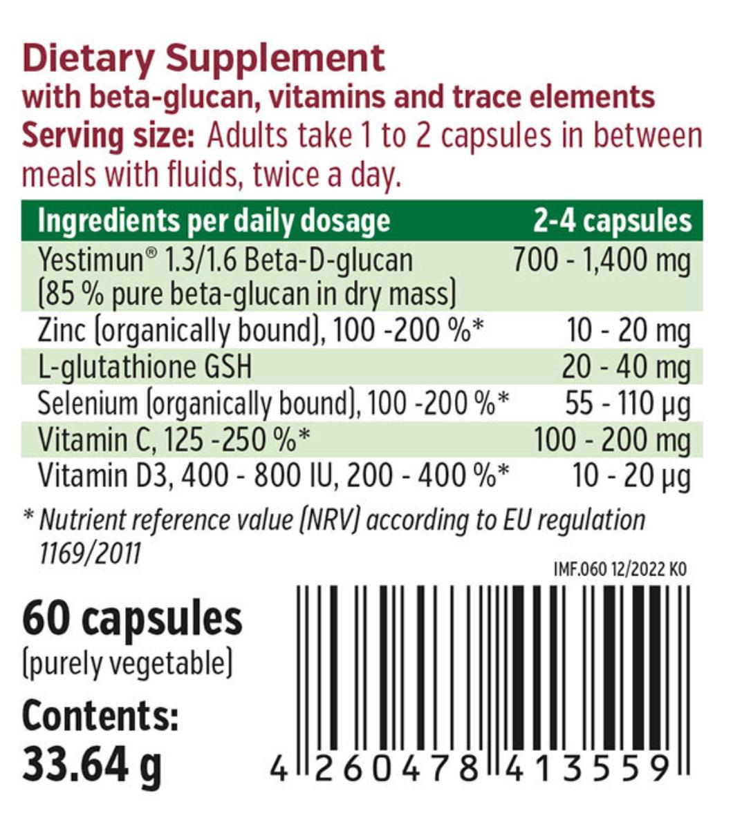Nahrungsergänzungsmittel mit Beta-Glucan, Vitaminen, Spurenelementen und Quercetin