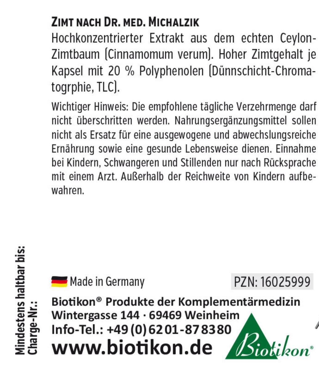 Zimt (Ceylon-Zimt) von Dr. Michalzik®️ unterliegt der strengen Prüfung deutscher Kontrollbehörden. Die Herstellung erfolgt unter Einsatz schonender Produktionstechnologien ohne Hitze und Zusätze in der Kapselfüllung. Keine industriell hergestellte Kieselsäure (Siliciumdioxid) als Rieselhilfe. Biotikon® verwendet kein Siliciumdioxid oder Kieselsäure (SiO2, bekannt als E551) als Rieselhilfe. Ohne Verwendung von Verarbeitungshilfsstoffen, die nicht auf der Verpackung namentlich erwähnt werden müssen. Biotikon®️-Produkte werden gemäß den gesetzlichen Vorschriften und unter Einhaltung des HACCP-Konzepts hergestellt, um die Lebensmittelsicherheit zu gewährleisten.