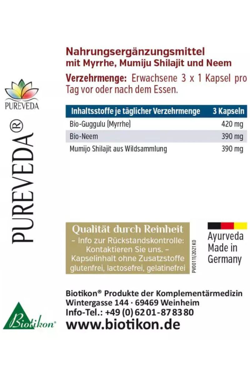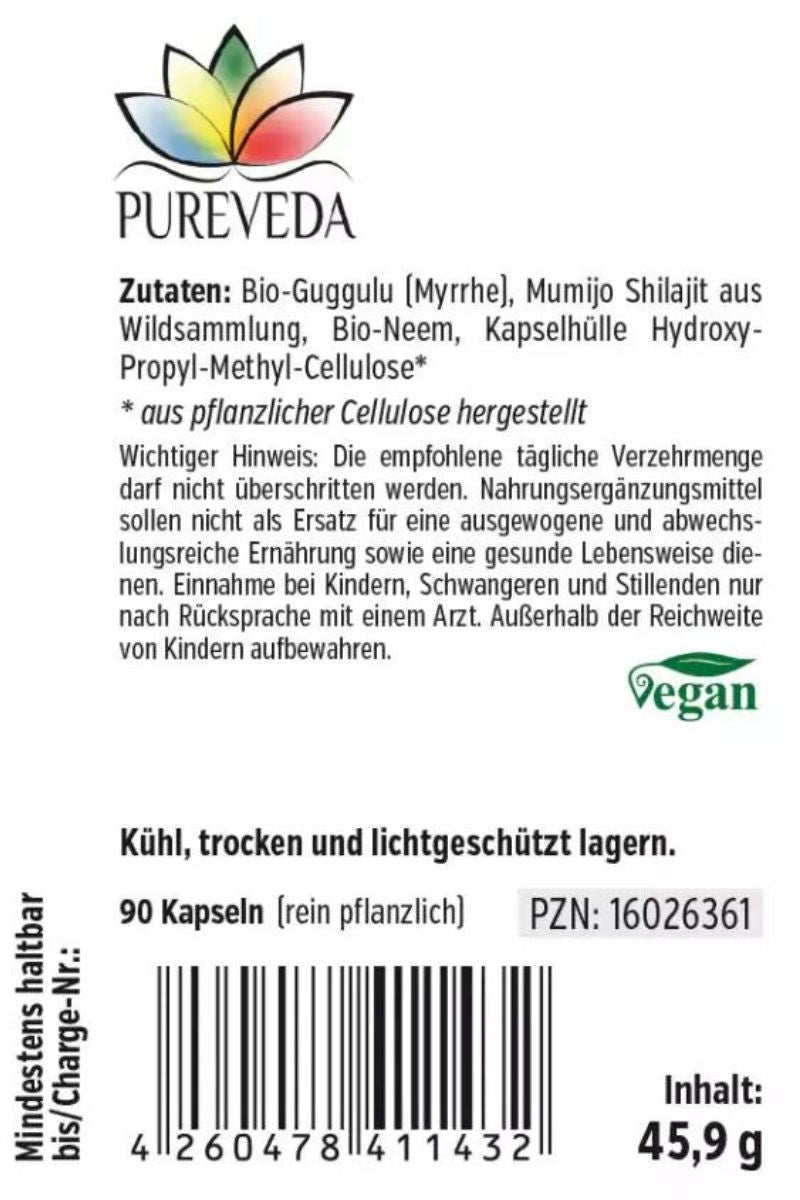 Ingredients: Organic Guggulu (myrrh), Mumijo Shilajit from wild harvesting, Organic Neem, Capsule material made of pure vegetable cellulose (Hydroxy-propyl-methyl-cellulose)