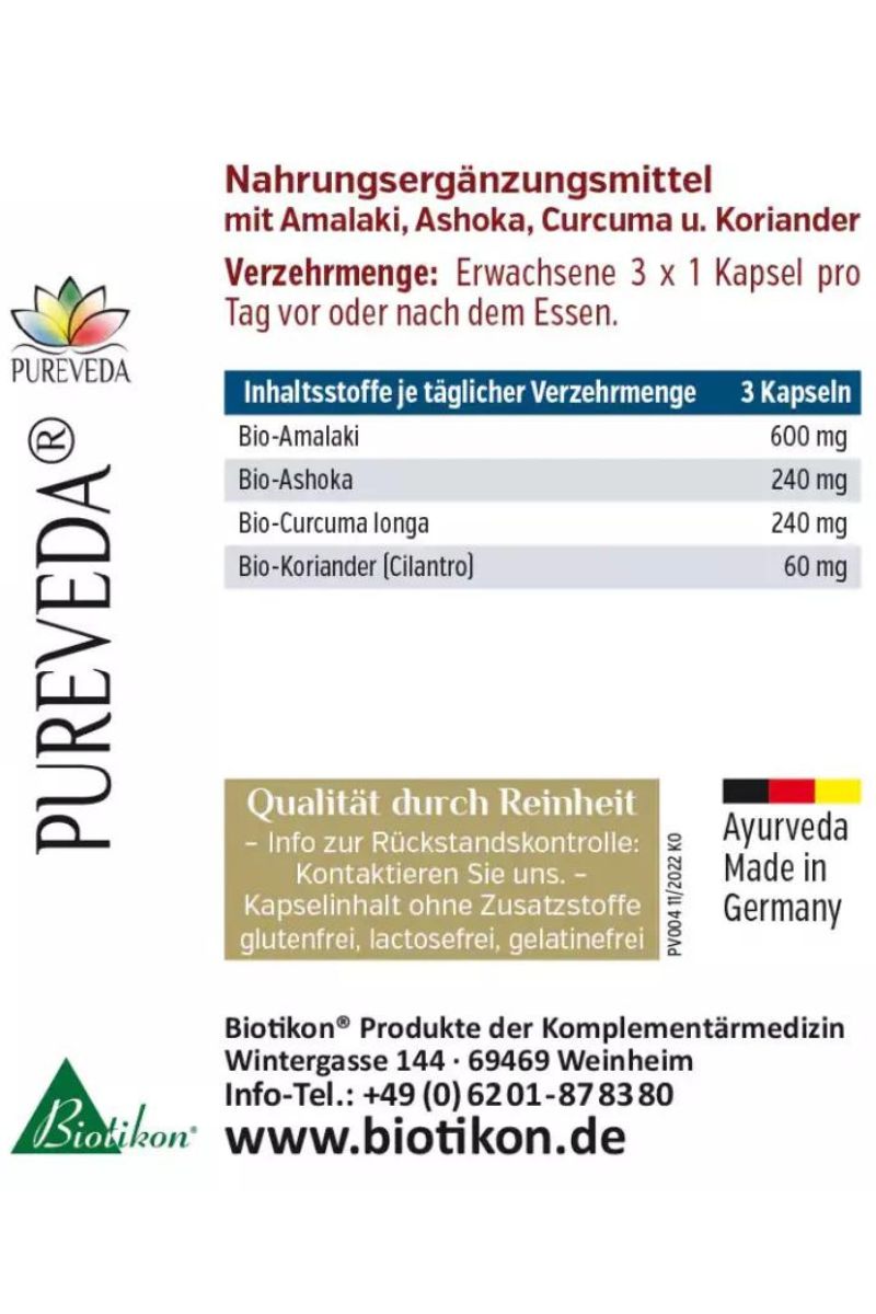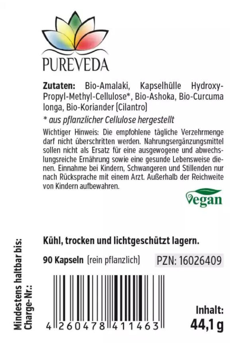 Ingredients: Organic Amalaki, Capsule material made of pure vegetable cellulose (Hydroxy-propyl-methyl-cellulose), Organic Ashoka, Organic Turmeric (Curcuma longa), Organic Coriander (Cilantro)