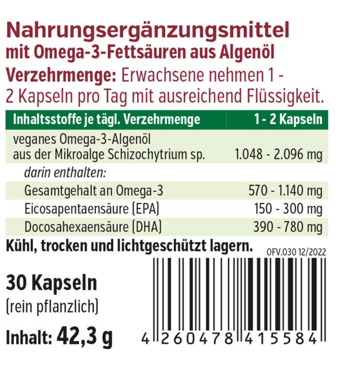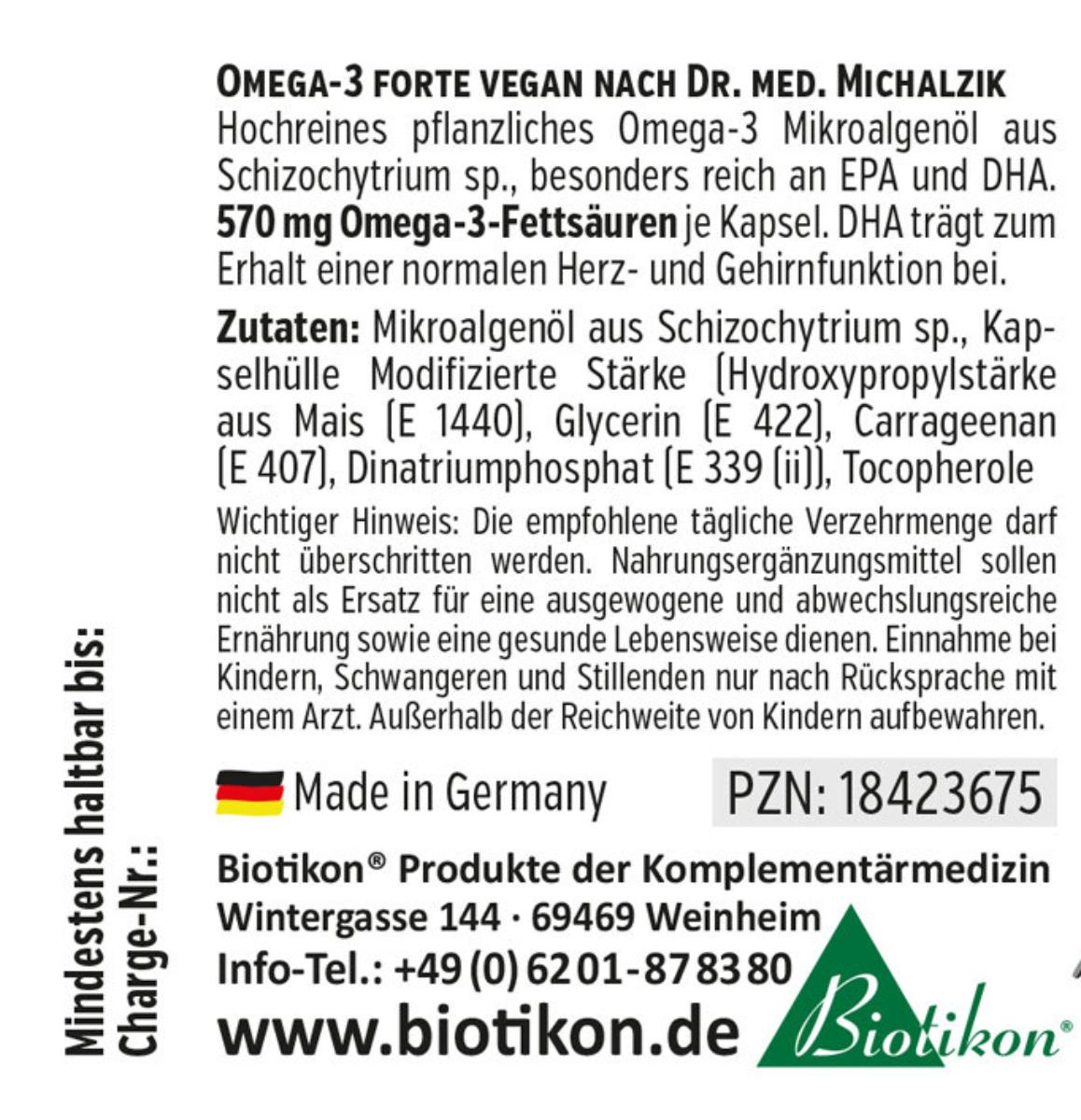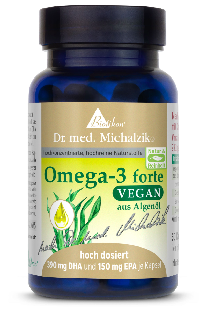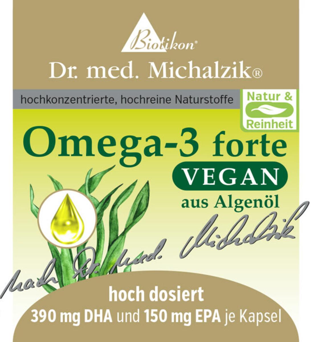 Omega-3 forte vegano por el Dr. Alexander Michalzik MDContiene aceite de microalga vegetal ultrapuro de Schizochytrium sp., que es especialmente rico en DHA y EPA. Muchos productos omega-3 de origen vegetal normalmente solo contienen DHA. Omega-3 forte vegan del Dr. Alexander Michalzik MD contiene 390 mg de DHA y 150 mg de EPA por cápsula en la proporción óptima de DHA a EPA 3:1.