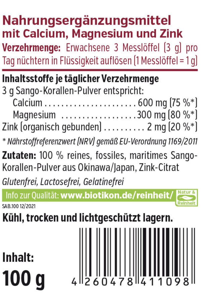 Ingredienser:100 % rent, fossilt, maritimt Sango-korallpulver fra Okinawa/Japan, sinksitrat