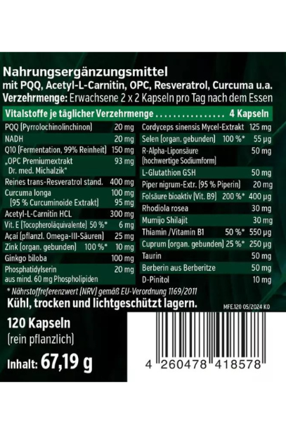 Mitochondriol® inneholder spesifikke stoffer som fisetin, quercetin, NADH, samt CoQ10, som kan beskytte mitokondriene mot de destruktive angrepene fra frie radikaler og støtte biogenesen av nye mitokondrier. Disse stoffene bidrar til å opprettholde mitokondrielle strukturer og forbedre deres funksjonalitet, noe som er avgjørende for å opprettholde fysisk vitalitet i alderdommen.