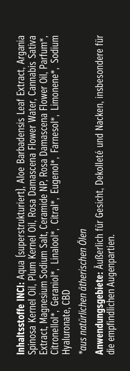 Aqua (superestruturado), extrato de folha de Aloe barbadensis, óleo de semente de Argania spinosa, óleo de semente de ameixa, água de flor de Rosa damascena, extrato de Cannabis sativa, sal de magnésio e sódio, ceramida NP, óleo de flor de Rosa damascena, parfum *, citronelol *, geraniol *, linalol *, citral *, eugenol *, farnesol *, limoneno *, hialuronato de sódio, CBD