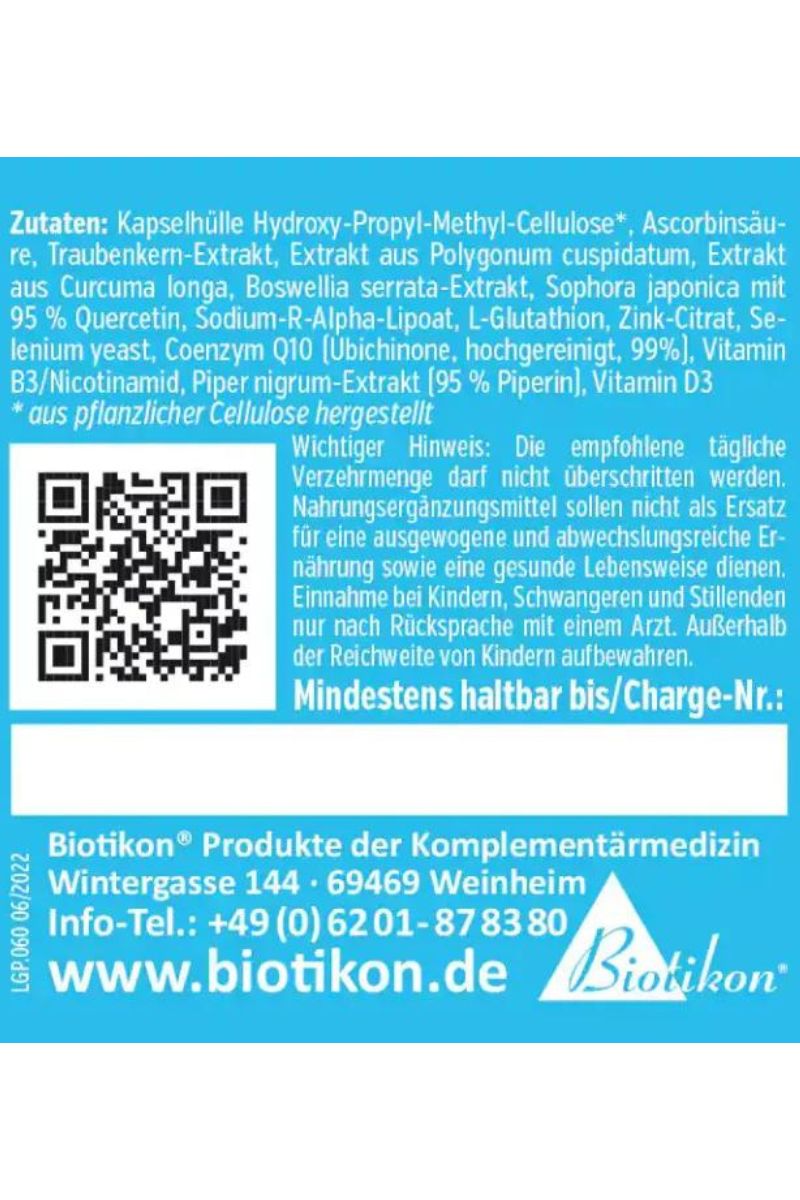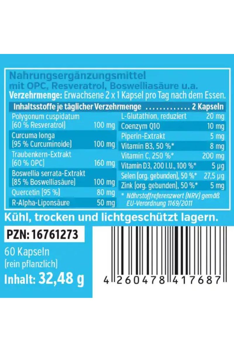 Ingrediente:învelișul capsulei: hidroxilpropil-metil-celuloză**, acid ascorbic, extract din semințe de struguri, extract din Polygonum cuspidatum, extract din Curcuma longa, extract de Boswellia serrata, Sophora Japonica cu 95 % quercetină, R-alfa lipoat de sodiu, L-glutation, zinc citrat, drojdie de seleniu, coenzima Q10 (ubichinonă, înalt purificată, 99 %), vitamina B3/nicotinamida, extract de piper nigrum (95 % piperina), vitamina D3.