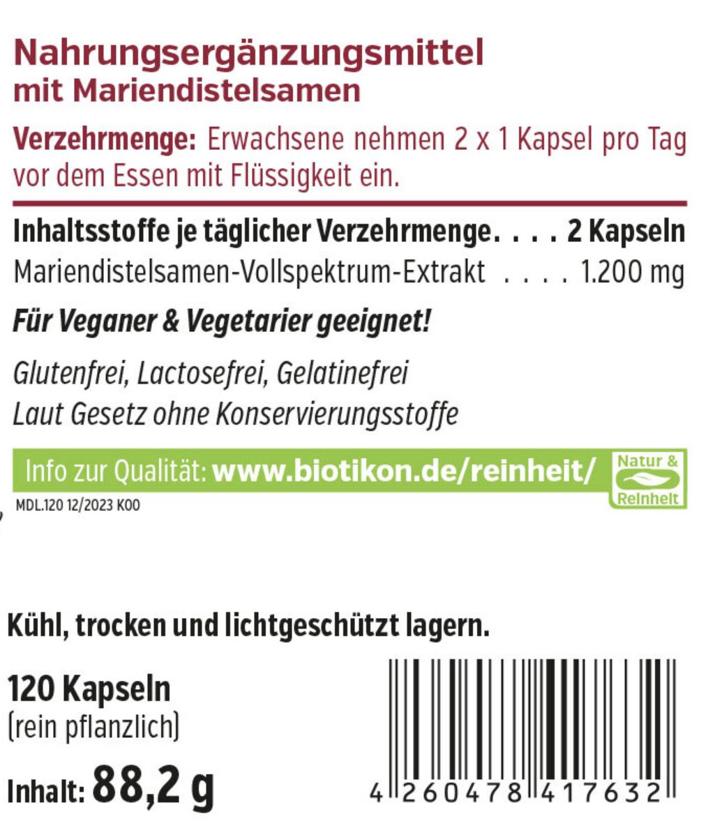 Milk Thistle de Dr. Michalzik®️ face obiectul unor examinări stricte ale autorităților germane de supraveghere. Este fabricat prin utilizarea unor tehnologii de producție blânde, fără căldură sau aditivi în umplerea capsulei. Nici un ajutor de curgere a acidului silicic (dioxid de siliciu) produs industrial. Biotikon® nu folosește dioxid de siliciu sau acid silicic (SiO2, cunoscut sub numele de E551) ca auxiliar de curgere. Fără utilizarea agenților de procesare, care nu trebuie să fie menționați pe ambalaj. Produsele Biotikon®️ sunt fabricate în conformitate cu cerințele legale și în conformitate cu conceptul HACCP pentru a asigura siguranța alimentară.