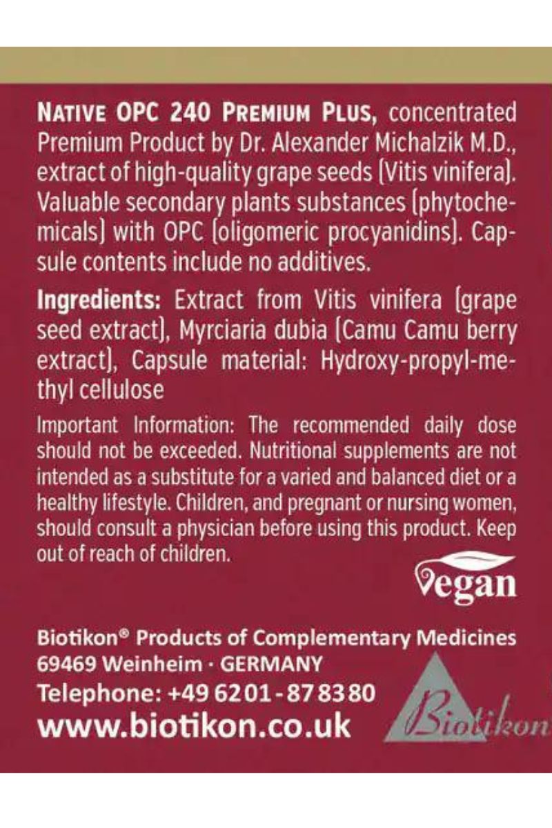 72 Native OPC 240 premium plus-capsule, fiecare capsulă conține 450 mg extract din semințe de struguri și 40 mg extract CamuCamu.